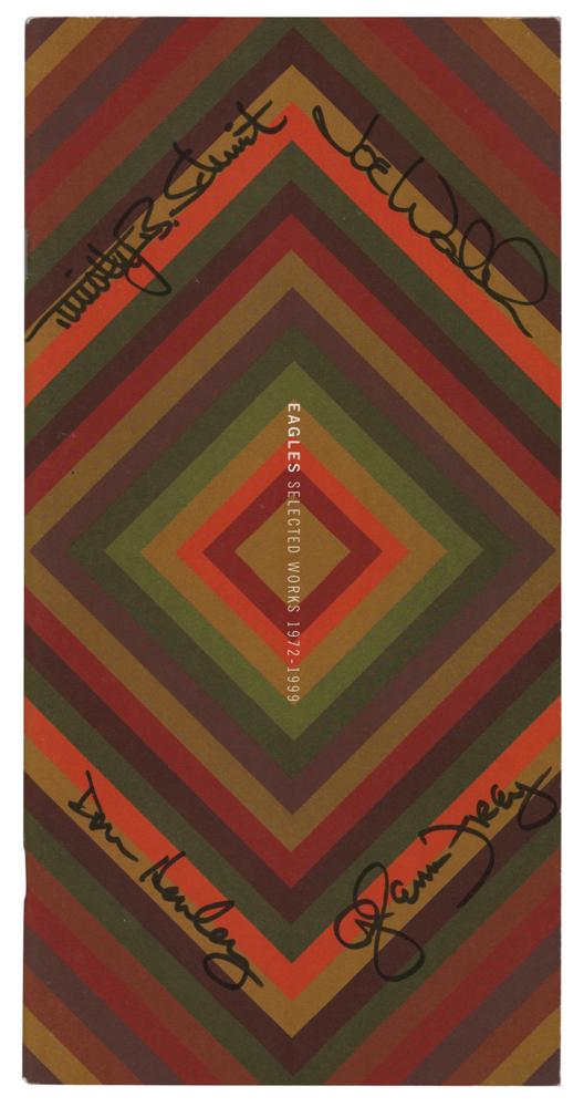 Booklet included with Selected Works: 1972-1999, the compilation box set by the Eagles, 44 pages, 5.5 x 11, signed nicely on the front cover in black felt tip by Don Henley, Glenn Frey, Joe Walsh, and Timothy B. Schmitt. In fine condition. Accompanied by a full letter of authenticity from REAL.