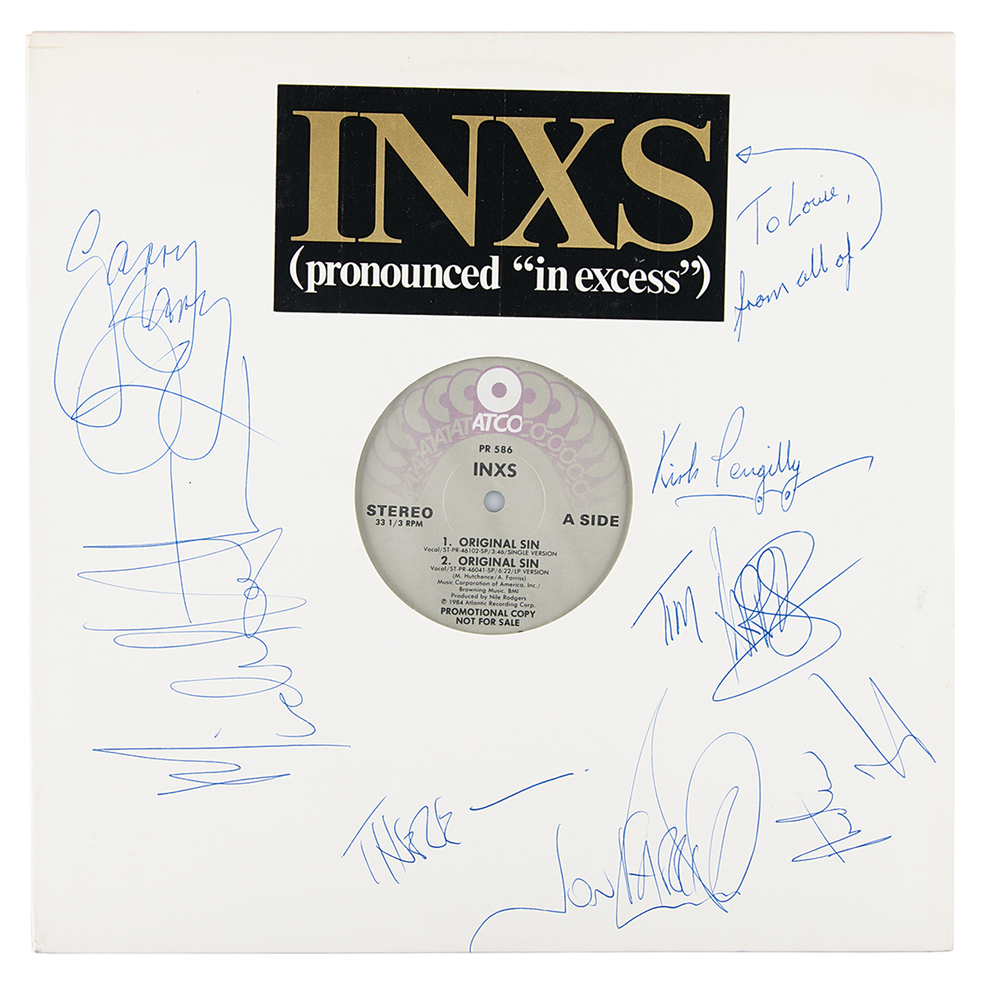 Atlantic Records 12″ promotional album for the INXS single ‘Original Sin,’ signed on the album sleeve in blue ballpoint by Michael Hutchence, Tim Farriss, Garry Gary Beers, Jon Farriss, Andrew Farriss, and Kirk Pengilly, who adds the inscription, “To Louie, from all of,” drawing an arrow to the affixed band sticker. In fine to very fine condition. The record is included.