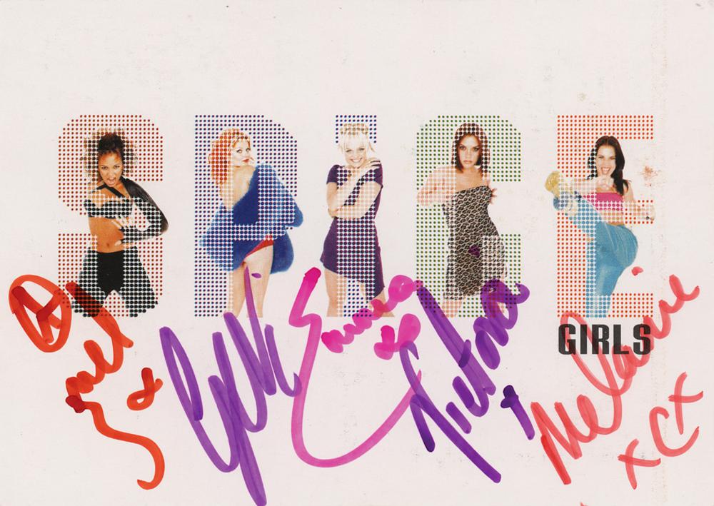 Color 5.75 x 4.25 postcard for Spiceworld, the second studio album by the Spice Girls, signed in multicolored felt tip by Victoria Beckham, Melanie Chisholm, Melanie Brown, Geri Halliwell, and Emma Bunton. In very fine condition.