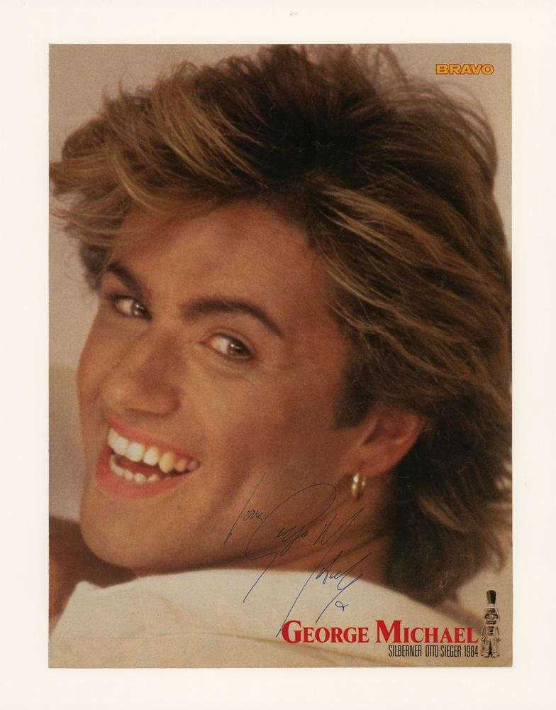 Color 8.25 x 11 page removed from the German teen magazine Bravo, showing a young George Michael in a handsome up-close pose, signed in blue ballpoint, "Love, George Michael, x." The photo is affixed to a slightly larger acid-free cardstock sheet. In fine condition. Accompanied by a full letter of authenticity from REAL.