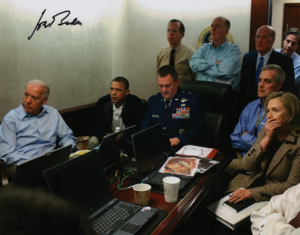 Color satin-finish 14 x 11 photo of President Barack Obama, Vice President Joe Biden, and former Secretary of State Hillary Clinton, along with other members of the national security team, as they receive an update on the mission against Osama bin Laden in the Situation Room of the White House on May 1, 2011, signed in black felt tip, "Joe Biden." In very fine condition, with a JSA label affixed to the reverse. Accompanied by a certificate of authenticity from JSA.