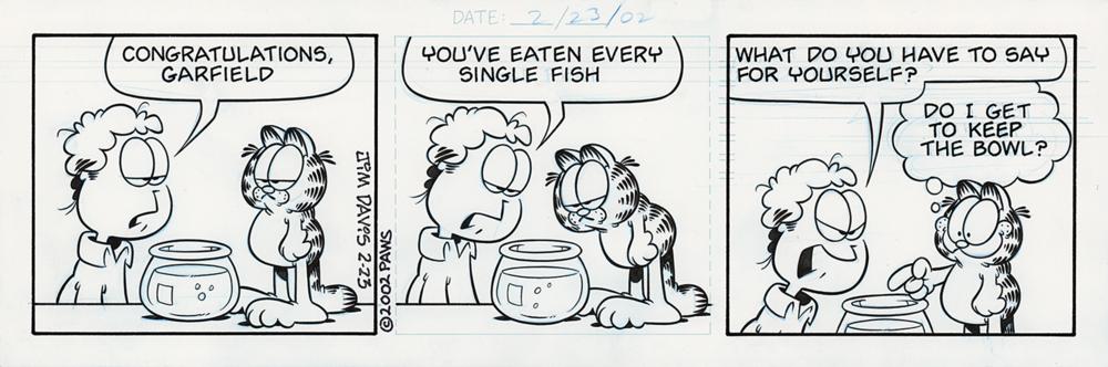 Original hand-drawn Garfield comic strip by Jim Davis, 15 x 5, signed vertically within the first panel, “Jim Davis, 2-23.” Accomplished in ink and artist pencil, the three-panel comic strip features Jon Arbuckle and Garfield conversing with an empty fish bowl between them: “Congratulations, Garfield?You’ve eaten every single fish?What do you have to say for yourself?,” to which the cat replies, “Do I get to keep the bowl?” The second panel bears a 2002 Paws copyright and the upper border contains the comic publication date of February 23, 2002. In very fine condition.