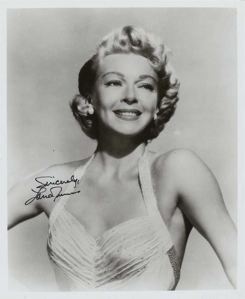 Glossy 8 x 9.75 photo of Turner in a striking sleeveless dress, signed in black felt tip, "Sincerely, Lana Turner." In fine condition, with a faint diagonal bend.
