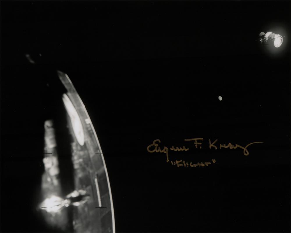 Satin-finish 10 x 8 photo as taken from the lunar module 'lifeboat' during the Apollo 13 mission, which shows the damaged service module and the moon, signed in gold ink, "Eugene F. Kranz, 'Flight.'" In fine condition, with one small crease to the top edge.