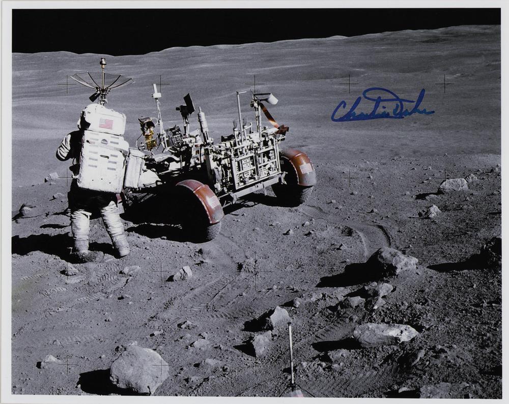 Color satin-finish 10 x 8 photo of LMP Charlie Duke working next to the lunar rover during the Apollo 16 moon mission, signed in blue felt tip. In very fine condition. The photo was taken at Station No. 4, near Stone Mountain, during the second Apollo 16 EVA at the Descartes landing site.