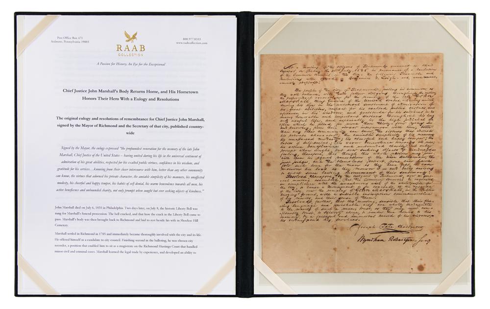 Original manuscript eulogy and resolutions of remembrance for Chief Justice John Marshall, signed by the Mayor of Richmond, "Joseph Tate, Chairman," and "Wyndham Robertson, Sec'y," one page, 7.25 x 8.75, July 10, 1835. The eulogy was published country-wide, and the manuscript descended within the Marshall family until 2018. The historic eulogy expresses "the profoundest veneration for the memory of the late John Marshall, Chief Justice of the United States—having united during his life in the universal sentiment of admiration of his great abilities, respected for his exalted public virtues, confidence in his wisdom, and gratitude for his services?knowing from their closer intercourse with him, better than any other community can know, the virtues that adorned his private character, the amiable simplicity of his manners, his unaffected modesty, his cheerful and happy temper, his habits of self-denial, his warm benevolence towards all men, his active beneficence and unbounded charity, not only prompt when sought but ever seeking objects of kindness." In very good to fine condition, with toning and some scattered staining. Accompanied by four original newspapers honoring Chief Justice Marshall on the occasion of his death, including: Niles' Weekly Register (July 18, 1835), National Intelligencer (July 11, 1835), The Richmond Whig & Public Advertiser (July 10, 1935), and The Richmond Whig & Public Advertiser (July 17, 1835).