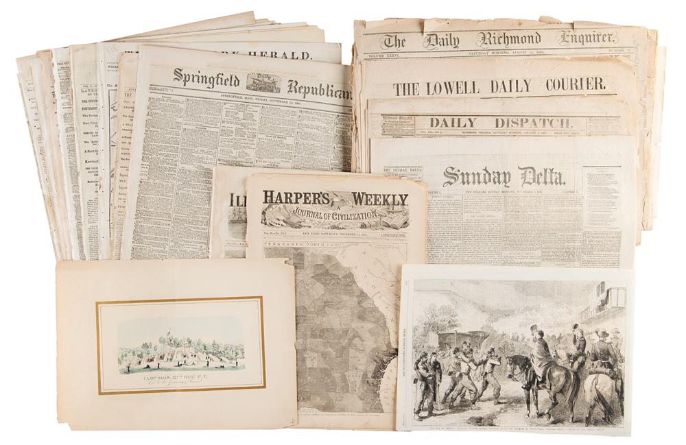 Comprehensive archive of over 35 original newspapers from 1861-1863, covering Civil War skirmishes and battles in Northern Virginia (Lewinsville, Dranesville, Fredericksburg and the vicinity), including both Northern and Southern perspectives, with several featuring detailed battle maps on the front pages. Many issues of the Daily National Intelligencer are partially bound together. Highlights: