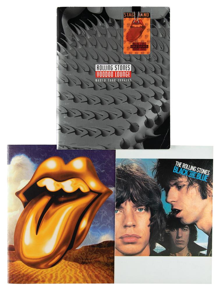 Three programs for Rolling Stones concert tours, including: The Rolling Stones Tour of Europe '76, associated with the release of their Black and Blue album; the Voodoo Lounge World Tour of 1994/95, with stagehand pass; and the Bridges to Babylon World Tour of 1997/98. In overall fine condition, with a crease and small piece of tape to the inside cover of the Voodoo Lounge program.