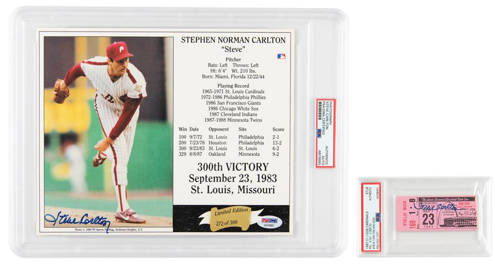 Two items signed by Steve Carlton, both encapsulated by PSA/DNA: a ticket stub from Steve Carlton's 300th win on September 23, 1983, signed in blue felt tip by Carlton and encapsulated by PSA/DNA; and a limited edition color 10 x 8 cardstock photo honoring his historic 300th victory, numbered 272/300, signed in blue felt tip by Carlton and encapsulated by PSA/DNA. In overall fine condition.