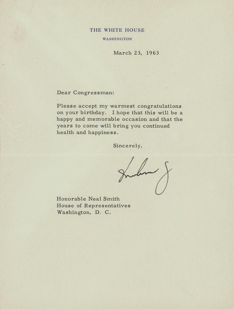 TLS as president, one page, 6.75 x 9, White House letterhead, March 23, 1963. Letter to Congressman Neal Smith of Iowa, in part: "Please accept my warmest congratulations on your birthday. I hope that this will be a happy and memorable occasion and that the years to come will bring you continued health and happiness." In fine condition. Accompanied by a full letter of provenance from University Archives.