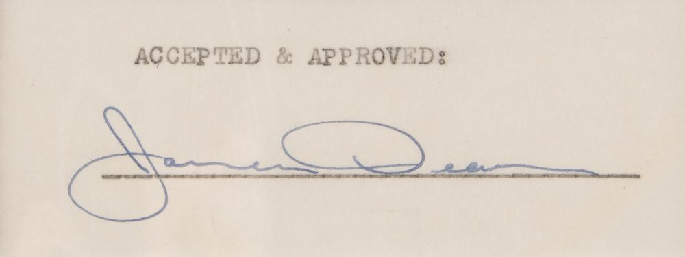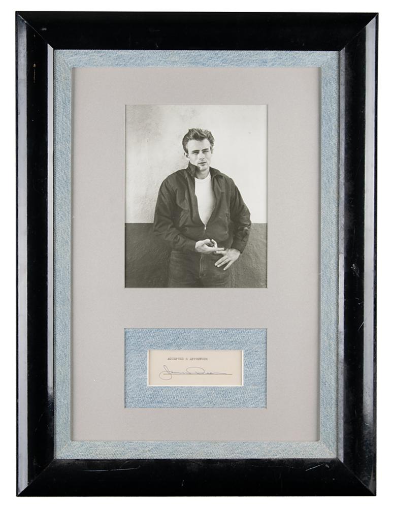Ultra-desirable vintage fountain pen signature, "James Dean,” on an off-white 4.75 x 1.75 slip. Handsomely double-matted and framed with a portrait to an overall size of 17.75 x 23.75. In fine condition. A great display evoking the denim-clad star's iconic style.