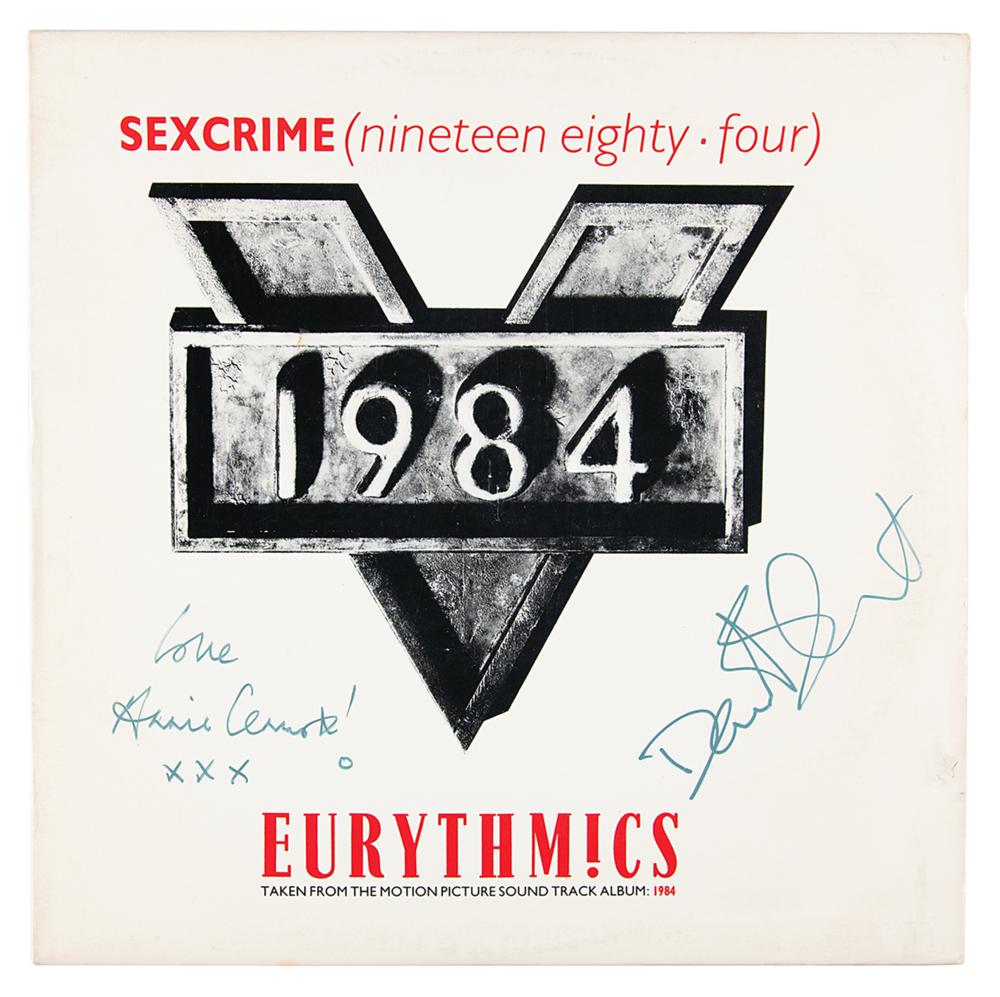 UK 12-inch vinyl pressing of the Eurythmics 1974 single ‘SEXCRIME (nineteen eighty four),’ signed on the front cover in silver ink, “Love, Annie Lennox! xxx” and “Dave Stewart.” In fine condition. The record is included. Accompanied by a certificate of authenticity from Tracks.