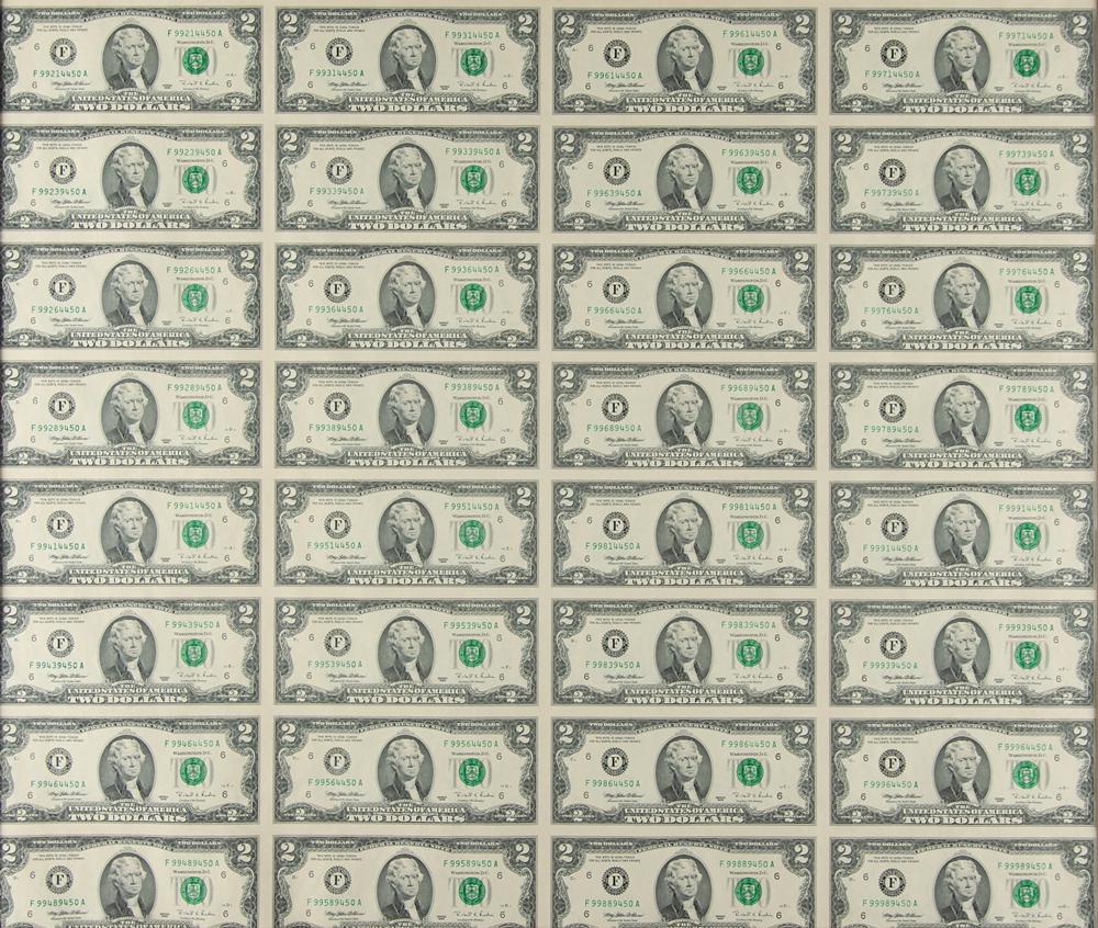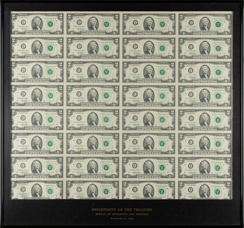 Attractive display containing an uncut sheet of 32 Series 1995 two-dollar bills issued by the Federal Reserve Bank of Atlanta, with each serial number beginning with “F.” The sheet is displayed below its original “Department of the Treasury, Bureau of Engraving and Printing” matting and framed to an overall size of 26.75 x 25. The consignor notes that this presentation was purchased over 20 years ago and that the Treasury no longer offers these framed in-house displays for sale. In very fine condition and ready for hanging.