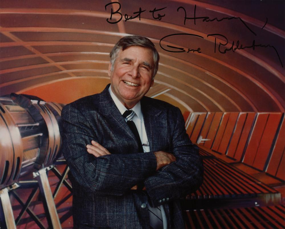 Color glossy 10 x 8 photo of Star Trek creator Gene Roddenberry on a set from the iconic television show, signed and inscribed in black felt tip, "Best to Harry, Gene Roddenberry.” In fine condition.