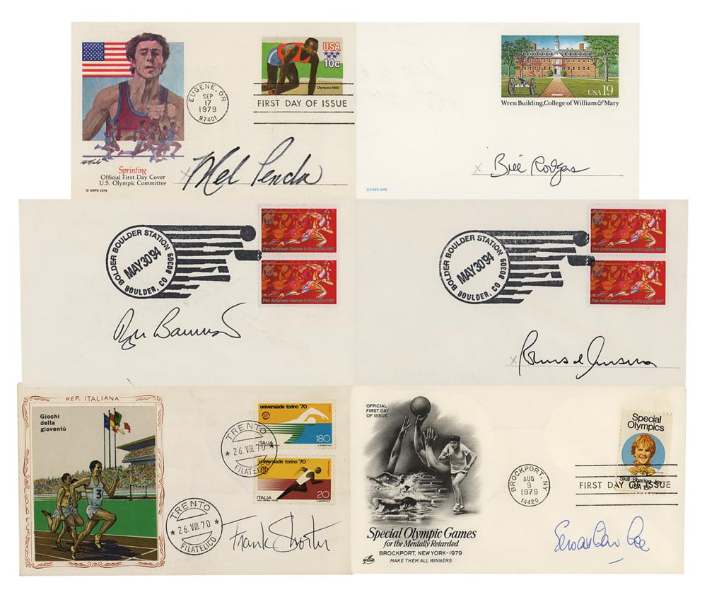 Six commemorative covers signed by Olympic runners, including: Roger Bannister, Frank Shorter, Bill Rodgers, Robert de Castella, Sebastian Coe, and Mel Pender. In overall fine condition.