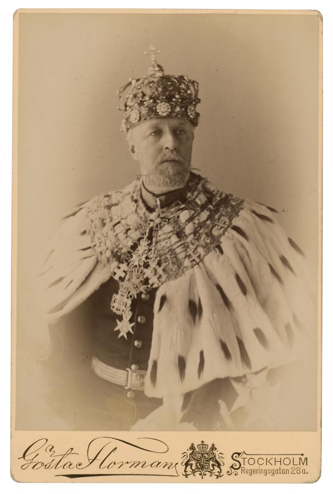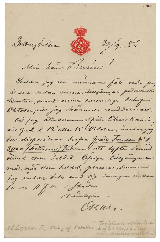 Nordic monarch (1829-1907) who reigned as King of Sweden (1872-1907) and King of Norway (1872-1905), during which both countries saw rapid periods of industrialization but a gradual decline of their union, resulting in a peaceful dissolution in 1905. Oscar is remembered as a patron of the arts and sciences, founding the world's first open-air museum at Bygdøy, commissioning a new opera house for the Royal Swedish Opera, and sponsoring the polar expeditions of Adolf Erik Nordenskiöld and Fridtjof Nansen. ALS in Swedish, signed “Oscar,” one page, 5.25 x 8.25, royal crest letterhead, September 30, 1886. Untranslated handwritten letter by Oscar II during his reign as King of Sweden and Norway. In fine condition. Accompanied by an outstanding original cabinet photo of Oscar II in his crown and regalia.