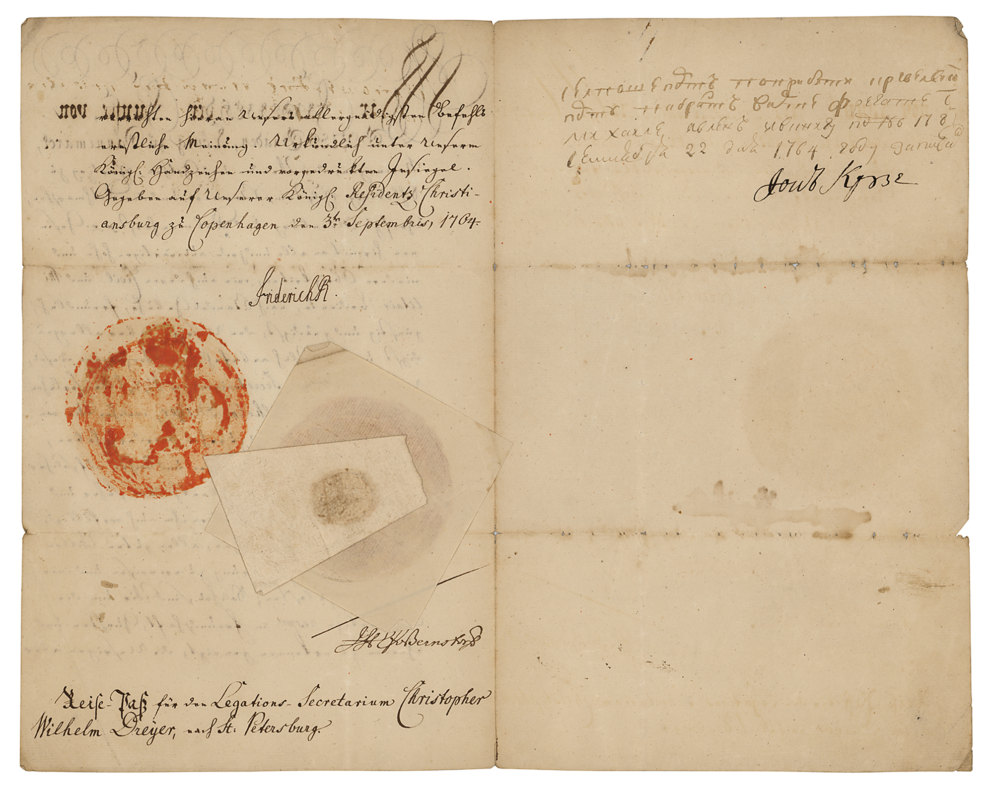 King of Denmark and Norway from 1746 until his death in 1766, who relied on his capable 'Age of Enlightenment' advisors to attend to matters of state while he pursued a libertine lifestyle. LS in German, signed “Friderick R,” one page both sides, 7.75 x 12.5, September 3, 1764. Untranslated official letter to Christopher Wilhelm Dreyer at St. Petersburg, signed at the conclusion by King Frederick V of Denmark and countersigned by the Danish statesman Count Johann Hartwig Ernst von Bernstorff. The paper seal affixed at the conclusion remains intact. In fine condition, with light overall wrinkling and a few small stains. Accompanied by four unsigned engraved portraits.