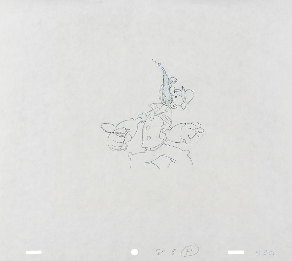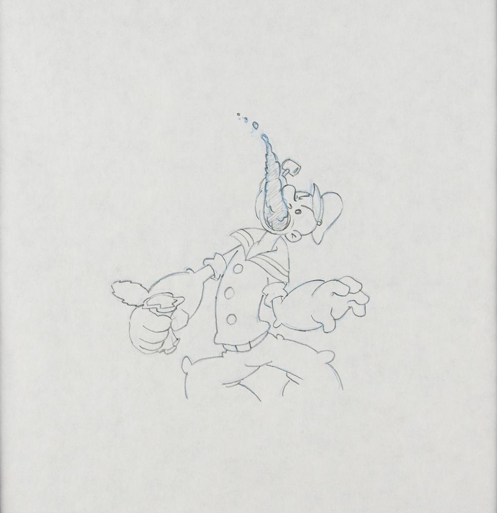 (Jaime Diaz Studios, circa 1984) Original production drawing of Popeye from an unknown Popeye cartoon, which shows the large-armed sailor gobbling a mouthful of spinach that he just squeezed from a can. Accomplished in graphite and colored pencil on 11.5 x 10.5 animation paper. Image measures 4 x 4.5, with a mat opening of 8 x 8. Double-matted to an overall size of 13 x 13. In fine condition. Accompanied by a statement of authenticity from Great American Ink.