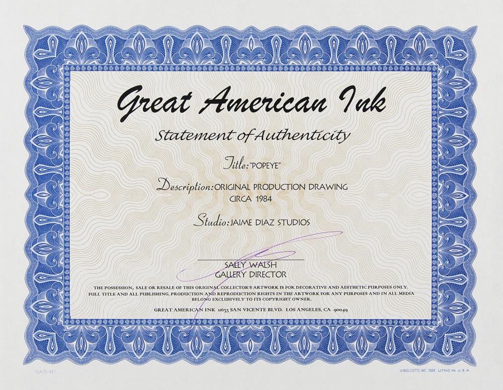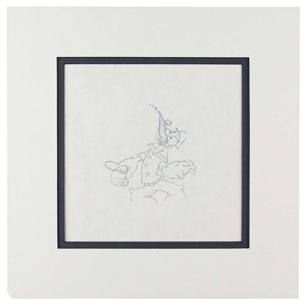 (Jaime Diaz Studios, circa 1984) Original production drawing of Popeye from an unknown Popeye cartoon, which shows the large-armed sailor gobbling a mouthful of spinach that he just squeezed from a can. Accomplished in graphite and colored pencil on 11.5 x 10.5 animation paper. Image measures 4 x 4.5, with a mat opening of 8 x 8. Double-matted to an overall size of 13 x 13. In fine condition. Accompanied by a statement of authenticity from Great American Ink.
