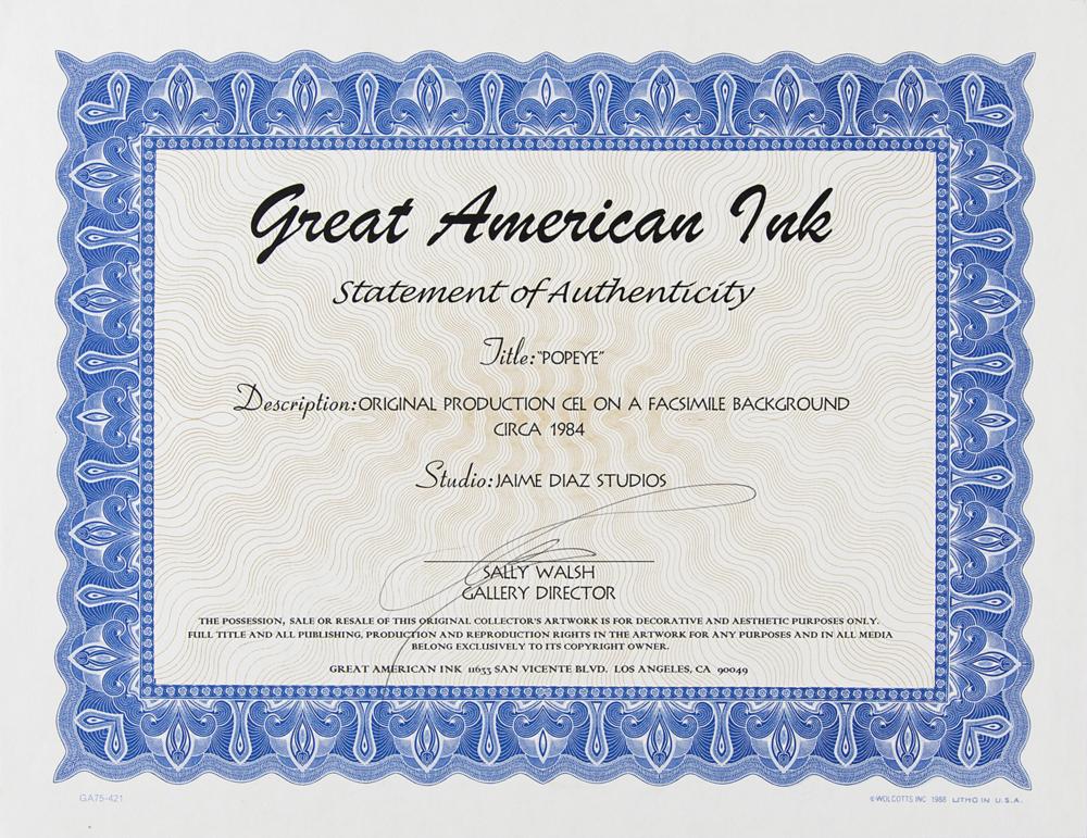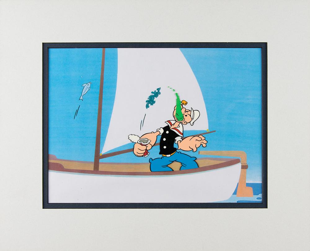 (Jaime Diaz Studios, circa 1984) Original production cel of Popeye from an unknown Popeye cartoon, which depicts the large-armed sailor gobbling a mouthful of spinach that he had just squeezed from a can. The cel is placed on an attractive matching facsimile background of a sailboat. Character image measures 4 x 4.25, with a mat opening of 11 x 8. Double-matted to an overall size of 16 x 13. In fine condition. Accompanied by a statement of authenticity from Great American Ink.