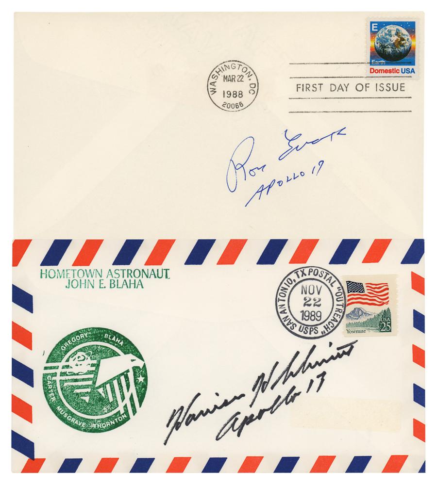 Two covers signed by Apollo 17 crewmen: a launch day cover for the Space Shuttle Discovery's mission STS-33, with a stamped cachet honoring the hometown of astronaut John E. Blaha, signed in black felt tip by the Apollo 17 LMP, "Harrison Schmitt, Apollo 17"; and a first day cover with a stamp honoring Earth, signed in blue ballpoint by the Apollo 17 CMP, "Ron Evans, Apollo 17." In fine condition.