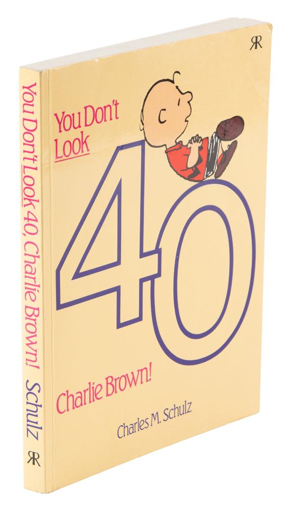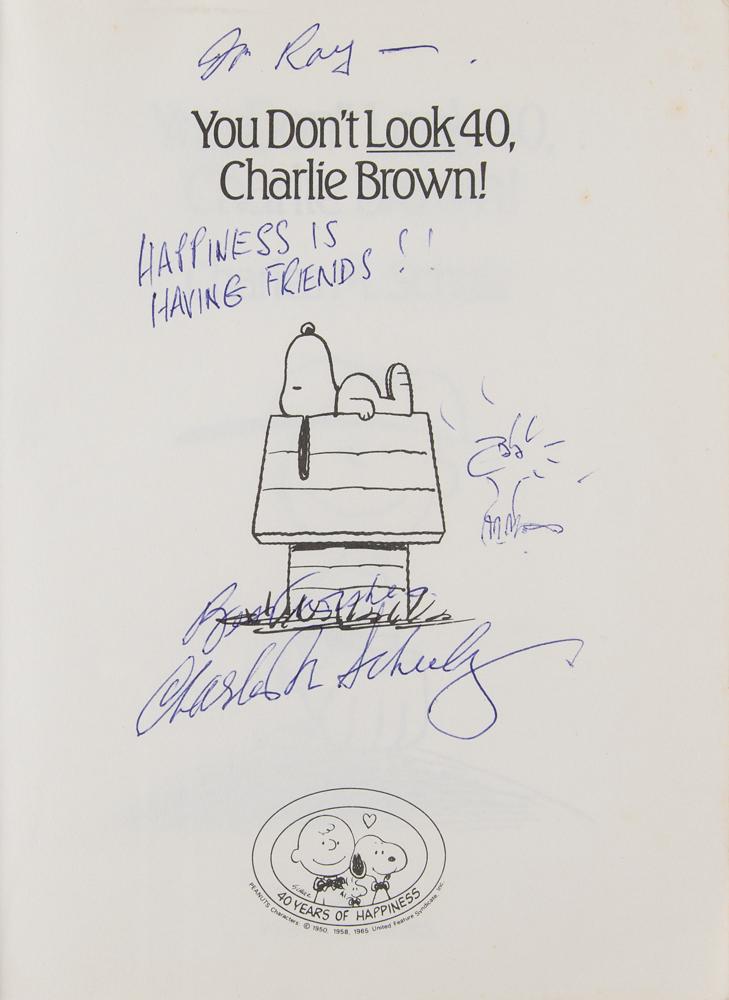Signed book: You Don't Look Forty, Charlie Brown. Horsham, West Sussex: Ravette Books, 1990. Softcover, 7 x 9. Signed and inscribed on the half-title page in blue ballpoint, "For Ray—Happiness is having friends!! Best wishes, Charles M. Schulz," who adds a wonderful small sketch of Woodstock to the right. In fine condition, with light creasing the cover.