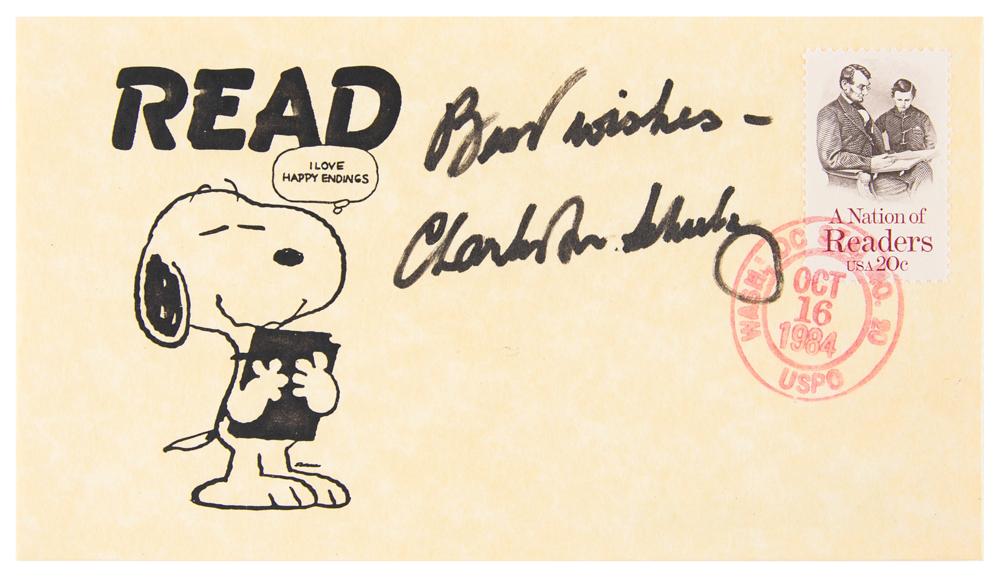 Limited edition cover with a literary awareness "READ" cachet of Snoopy holding a book and thinking 'I love happy endings,' numbered 14/30, postmarked on October 16, 1984, signed in black felt tip, "Best wishes—Charles M. Schulz." In fine condition. Accompanied by a block of two Peanuts stamps.