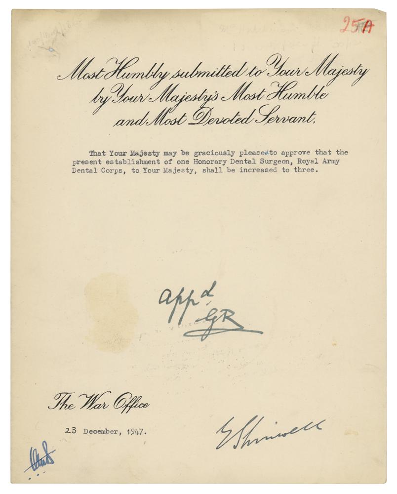 DS, signed “App'd, GR,” one page, 7.5 x 9.5, December 23, 1947. War Office document requesting King George VI's approval "that the present establishment of one Honorary Dental Surgeon, Royal Army Dental Corps, to Your Majesty, shall be increased to three." In fine condition, with a faint stain to the left of George's endorsement.
