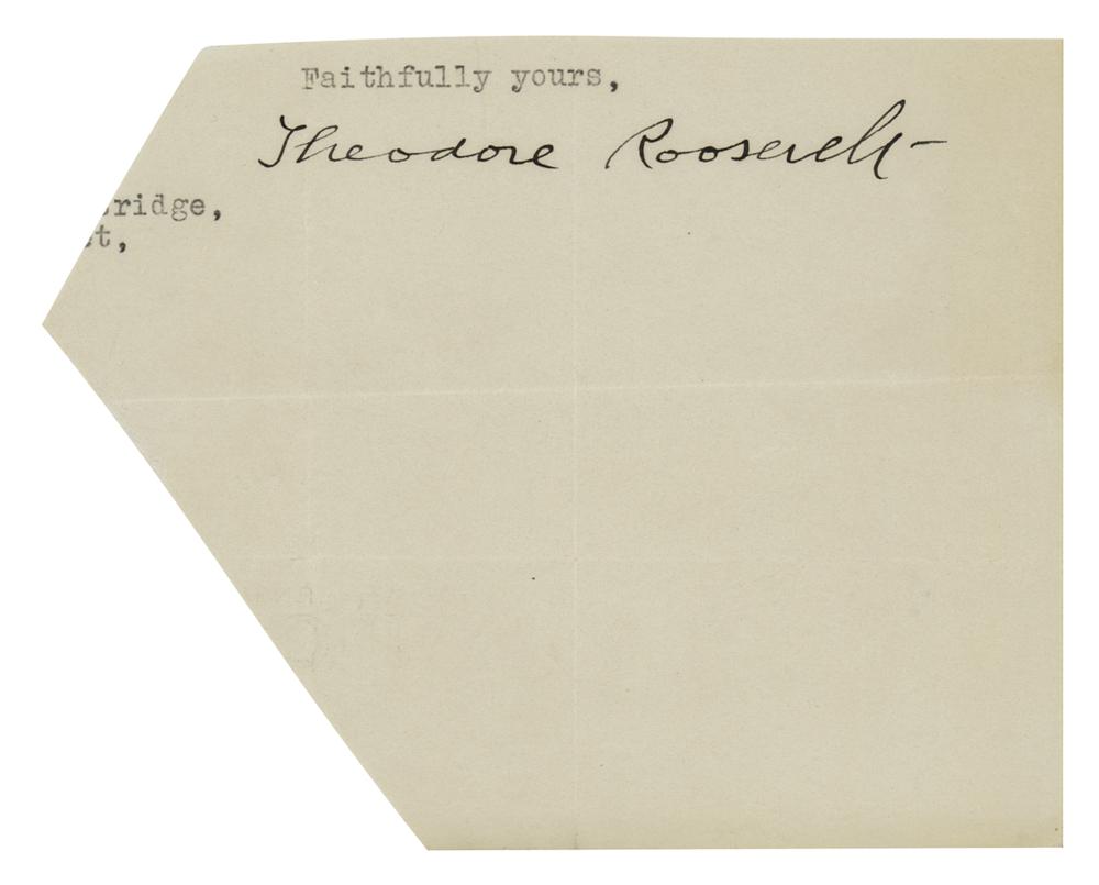 Bold ink signature, "Theodore Roosevelt,” on an off-white 5.25 x 4.25 slip clipped from the close of a letter. In fine condition, with light intersecting folds.