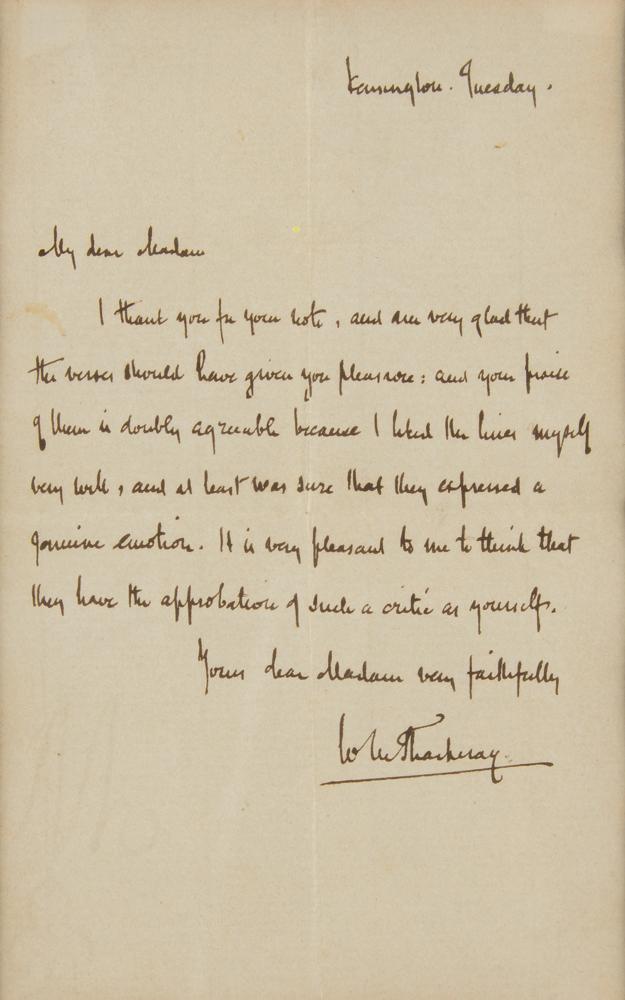 ALS signed “W. M. Thackeray,” one page, 4.25 x 6.75, no date. Handwritten letter, in part: "I thank you for your note, and am very glad that the verses should have given you pleasure: and your praise of them is doubly agreeable because I liked the lines myself very well and at least was sure that they expressed a genuine emotion." Matted and framed with a portrait to an overall size of 16.25 x 12.75; the backing bears an affixed Charles Hamilton Autographs certificate of authenticity and red wax seal. In fine condition.