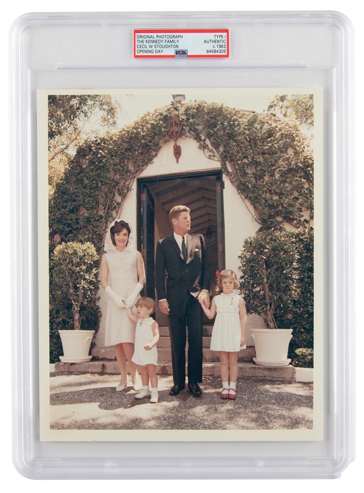 Original vintage color glossy 8 x 10 silver gelatin photo of President John F. Kennedy, First Lady Jacqueline Kennedy, and their children, Caroline and John, Jr., leaving St. Edward's Church in Palm Beach, Florida, following Easter Mass on April 14, 1963, taken by official White House photographer Cecil W. Stoughton. The reverse bears “A Kodak Paper” watermarks. In fine condition, with adhesive remnants on reverse. Encapsulated by PSA as an authentic 'Type I' photograph.