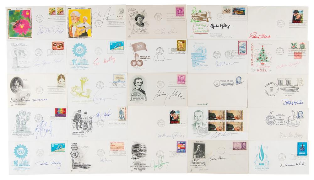 Group of 25 commemorative covers, each signed in ink by a notable writer, representing a variety of styles and genres. Includes: Kurt Vonnegut, Tom Clancy, William Golding, Arthur Miller, John Grisham, William Peter Blatty, Leon Uris, Robert Bloch, Andrew Greeley, Spike Milligan, Sue Monk Kidd, Khaled Hosseini, Arthur Hailey, John Hersey, John Kenneth Galbraith, Iris Murdoch, Farley Mowat, Sidney Sheldon, Herman Wouk, Norman Mailer, Jeffrey Archer, Mary Higgins Clark, Eric Bentley, Edward Albee, and Peter Straub. In overall fine condition.