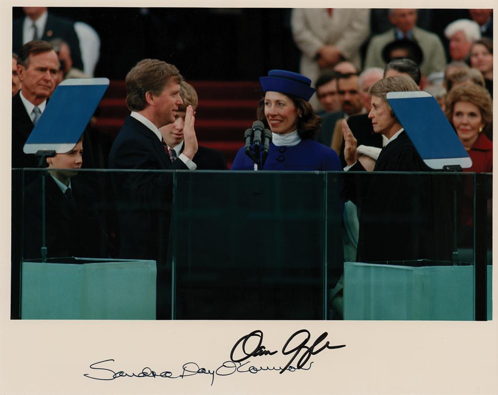 Color satin-finish 10 x 8 photo of Quayle reciting the vice president's oath of office, which was administered at his special request by Supreme Court Justice Sandra Day O'Connor, signed in the lower border in black felt tip by both. In fine condition.