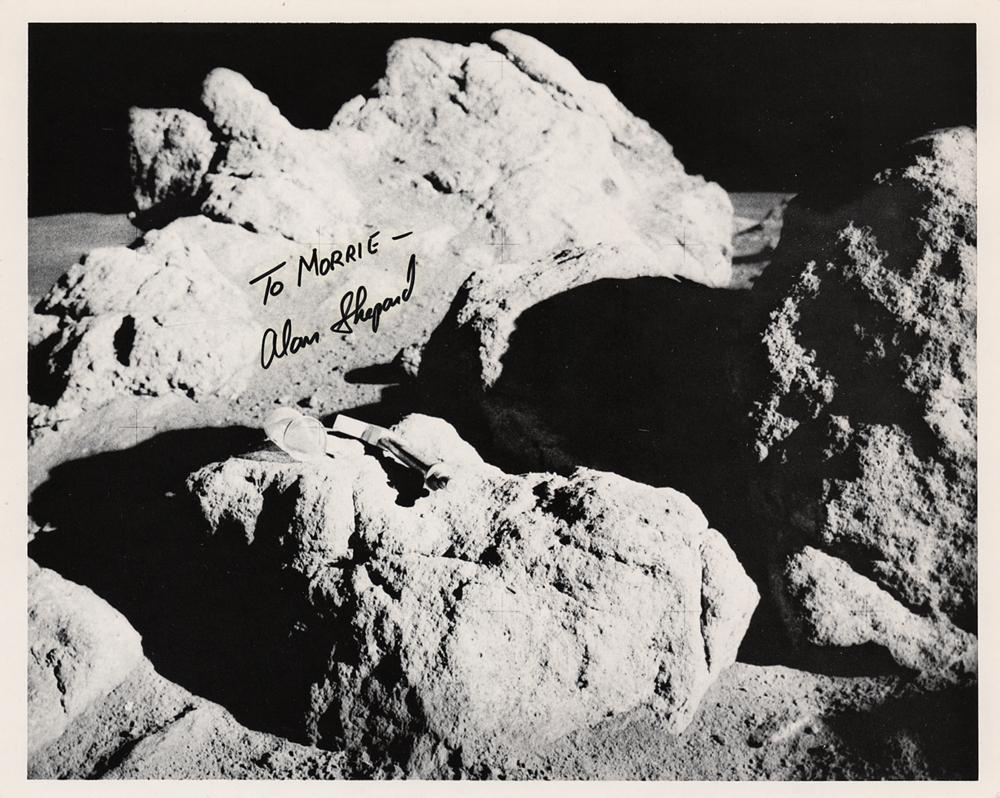 Official 10 x 8 NASA lithograph photo of a lunar boulder formation photographed during an Apollo 14 EVA, boldly signed and inscribed in black felt tip, "To Morrie—Alan Shepard.” In fine condition.