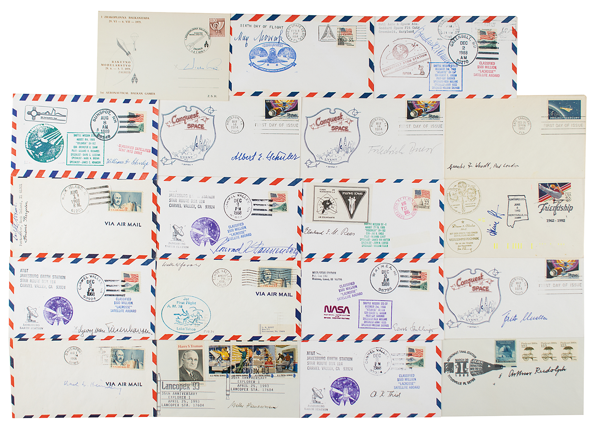 Collection of 19 commemorative covers signed by German rocket experts, several of whom were members of Wernher von Braun's pioneering V-2 rocket team who came stateside via Operation Paperclip, most with stamped cachets honoring various NASA achievements. Signers are: Arthur Rudolph, Adolf Thiel, Walter Haeussermann, Karl Heimberg, Fritz Mueller, Ernst Stuhlinger, Walter Jacobi, Georg von Tiesenhausen, Heinz Grosser, Eberhard Rees, Herbert Bergeler, Konrad Dannenberg, Dieter Grau, Friedrich Duerr, Albert Schuler, William Schulze, Max E. Nowak, Bernhard Tessmann, and Guenter Wendt. In overall fine condition.