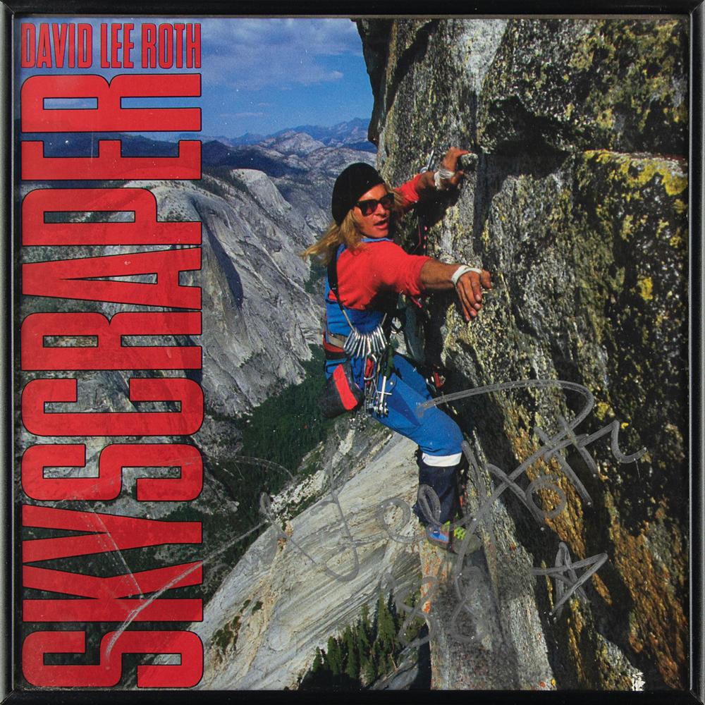 Skyscraper album by David Lee Roth, who has signed the front cover in silver paint pen and added "'88" and a star. Framed and in fine condition, with slight ink adhesion issues. Accompanied by an unused backstage sticker pass for a David Lee Roth concert in New Haven, Connecticut.