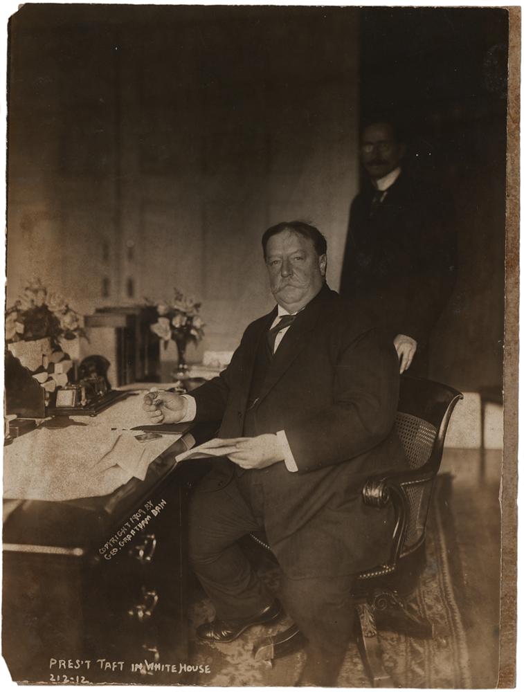 Scarce original pearl-finish 5.75 x 7.75 photographic proof of President William H. Taft by news photographer George Grantham Bain, which depicts Taft seated at his desk and looking squarely into the camera during the first year of his administration. Inherent to the image is a 1909 copyright mark and notations to lower border: “Pres. Taft in White House, 212-12.” This photographic proof is similar to a better-known image by Bain that is in the Library of Congress Collection. In very good to fine condition, with light silvering and edge wear; the photo is detached from its original mount.
