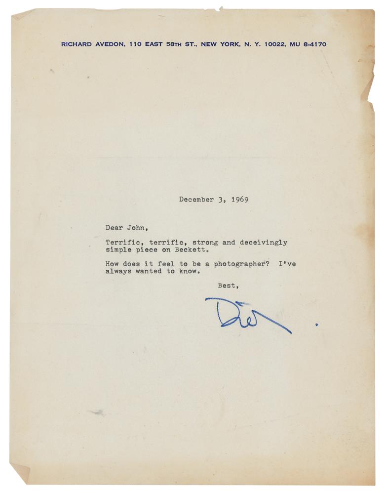 TLS signed “Dick,” one page, 8.5 x 11, personal letterhead, December 3, 1969. Avedon writes to art critic, author, and fellow photographer, John Gruen, in full: “Terrific, terrific strong and deceivingly simple piece on Beckett. How does it feel to be a photographer? I've always wanted to know." In fine condition. Avedon refers to Gruen's article on Samuel Beckett entitled 'Samuel Beckett Talks About Beckett,' which was published in the December 1969 issue of Vogue magazine.