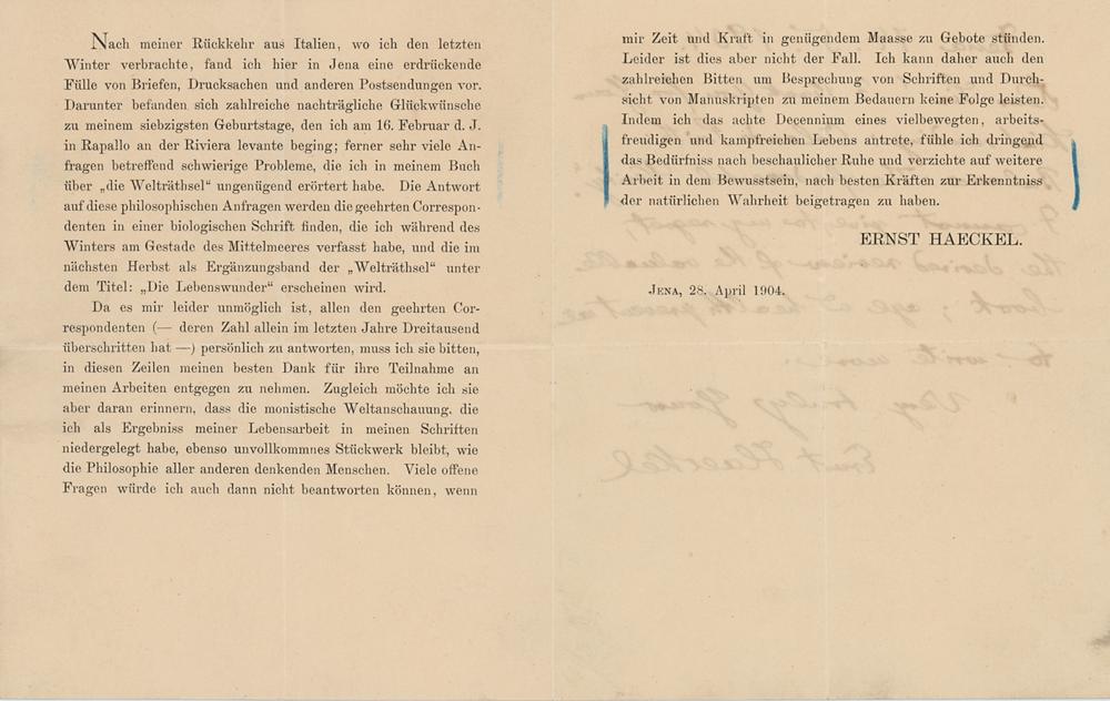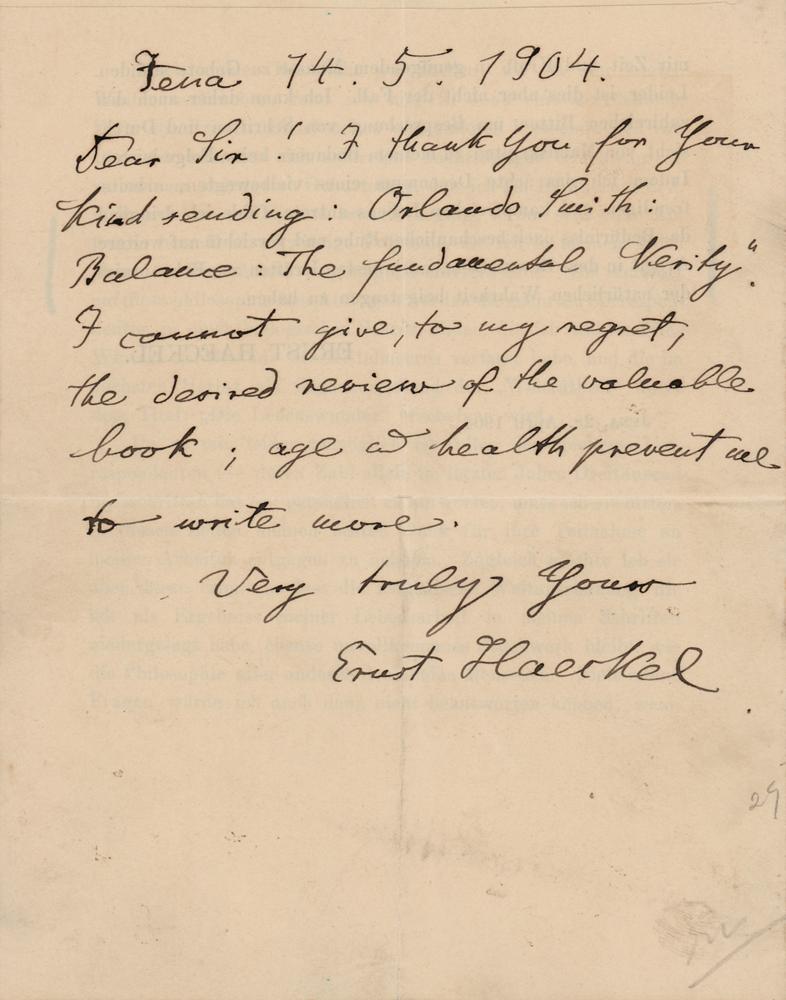 Influential German evolutionist, morphologist, and developmental biologist (1834-1919) remembered as a supporter and exponent of Charles Darwin's theories. Uncommon ALS in English, one page, 5.5 x 7, May 14, 1904. Handwritten letter to a gentleman, in part: "I thank you for your kind sending: Orlando Smith: Balance: The Fundamental Verity. I cannot give, to my regret, the desired review of the valuable book; age and health prevent me to write more." The letter is written on the reverse of a printed form letter regarding his inability to respond to all his correspondence. In fine condition.