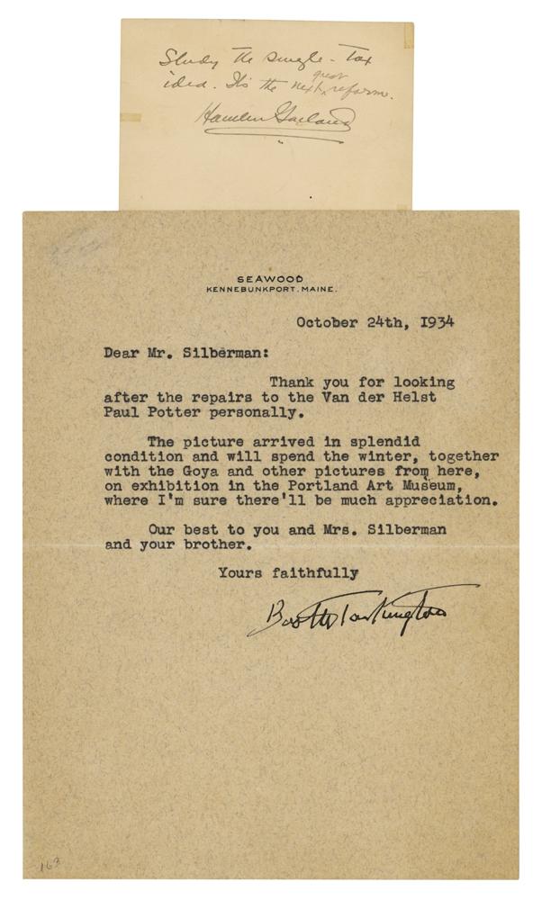Two items signed by Pulitzer Prize winners: a TLS signed "Booth Tarkington," one page, 5.5 x 7.5, October 24, 1934, in part: "Thank you for looking after the repairs to the Van der Helst Paul Potter personally. The picture arrived in splendid condition and will spend the winter, together with the Goya and other pictures from here, on exhibition in the Portland Art Museum, where I'm sure there'll be much appreciation"; and an ANS, "Study the single-tax idea. It's the net great reform, Hamlin Garland," on an off-white 3.25 x 2.25 card. In overall fine condition.