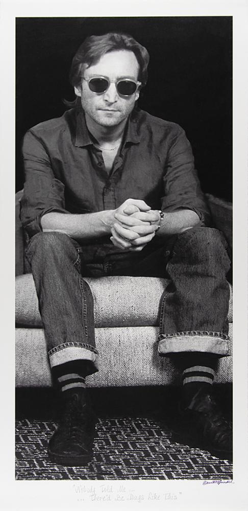 Limited edition 16.25 x 33 giclee print of a photograph of John Lennon taken by David Spindel entitled 'Nobody Told Me?There'd Be Days Like This,' depicting Lennon wearing sunglasses and seated with his hands clasped, signed in the lower right in ink by Spindel. The lower border also bears Spindel's photography blindstamp. Rolled and in fine condition. Spindel is perhaps best known for photographing John Lennon and Yoko Ono during Lennon's last recording sessions for Double Fantasy in 1980; he also co-created the poster for the Oscar-winning motion picture Platoon.