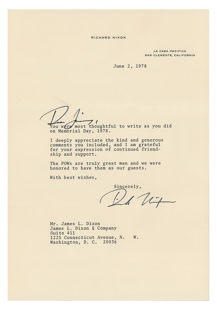 TLS signed “Dick Nixon,” one page, 7.75 x 10.5, June 2, 1978. Letter to James L. Dixon, in part: “You were most thoughtful to write as you did on Memorial Day, 1978. I deeply appreciated the kind and generous comments you included?The POWs are truly great men and we were honored to have them as our guests.” Nixon adds the salutation in his own hand, "Dear Jimmy." In fine condition. Accompanied by the original mailing envelope, bearing a pre-printed free frank.