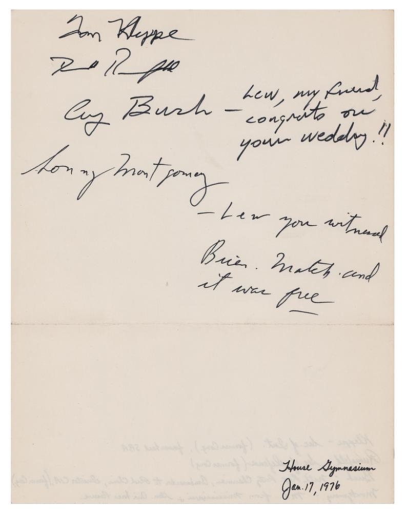 ANS, one page, 7 x 8.5, in full: “George Bush—Lew my friend, congrats on your wedding!!” Also signed by Tom Kleppe, Donald Rumsfeld, and Sonny Montgomery, who adds “Lew you witnessed Brier match and it was free.” Annotated in ink in the lower corner, “House Gymnasium, Jan. 17, 1976.” In fine condition, with light show-through at the bottom from a collector's notations on the back.