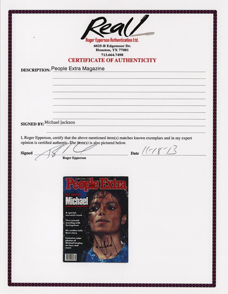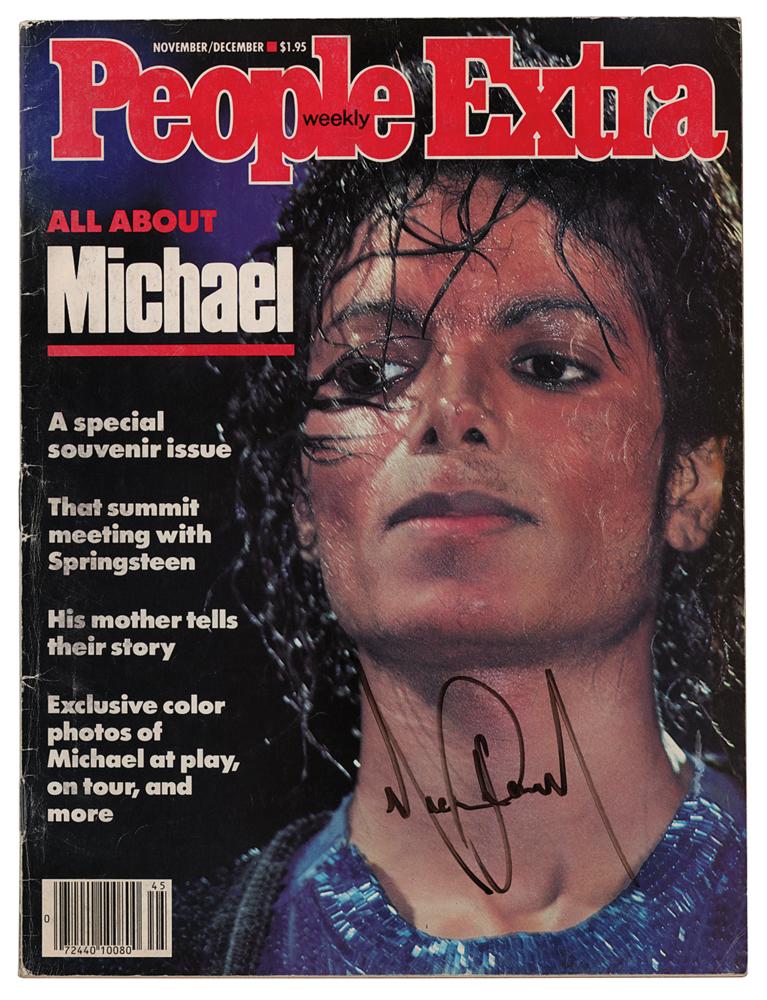 Special 'All About Michael' issue of People Extra magazine from November/December 1984, 8.25 x 11, 80 pages, signed on the front cover in black felt tip by Michael Jackson. In fine condition, with light handling wear. Accompanied by a full letter of authenticity from REAL.