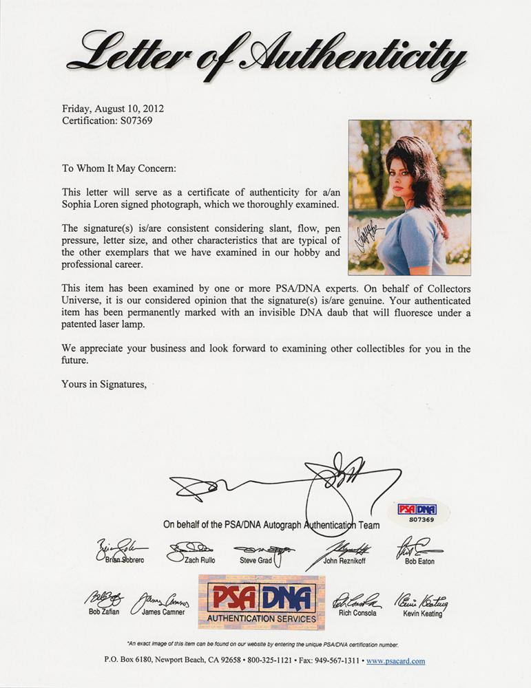 Mesmerizing color glossy 11 x 14 photo of Loren from early in her career, signed in black felt tip. In fine condition, with scattered small creases. Accompanied by a full letter of authenticity from PSA/DNA.