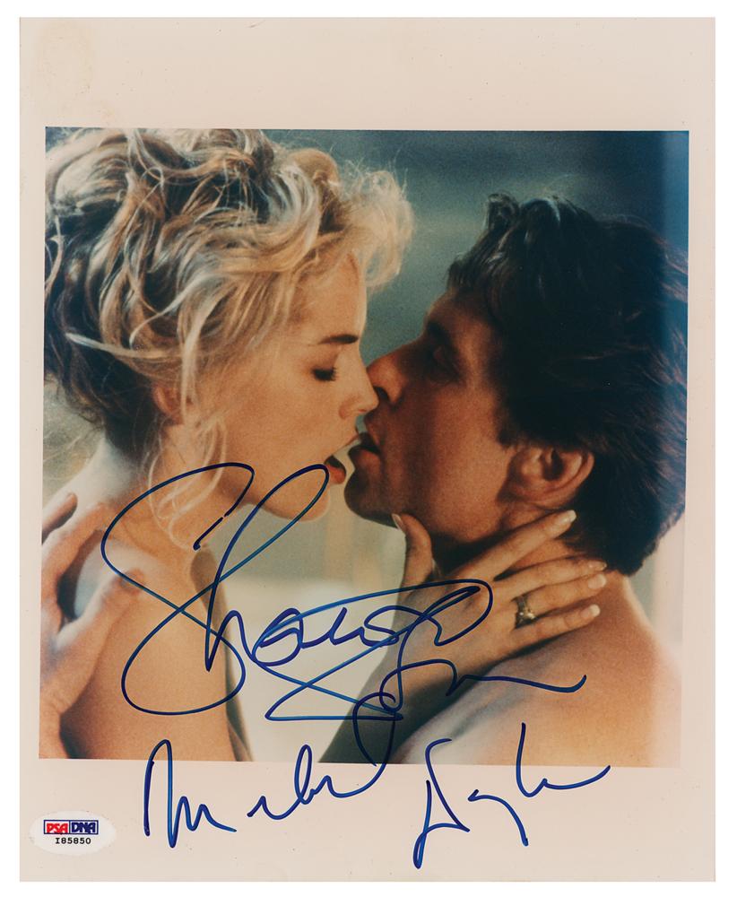 Color glossy 8 x 10 photo of a steamy scene from Basic Instinct, signed in blue felt tip by co-stars Michael Douglas and Sharon Stone. In fine condition, with scattered small creases and a PSA/DNA label affixed to the lower corner. Accompanied by a certificate of authenticity from PSA/DNA.
