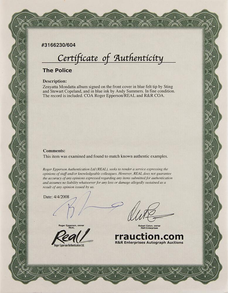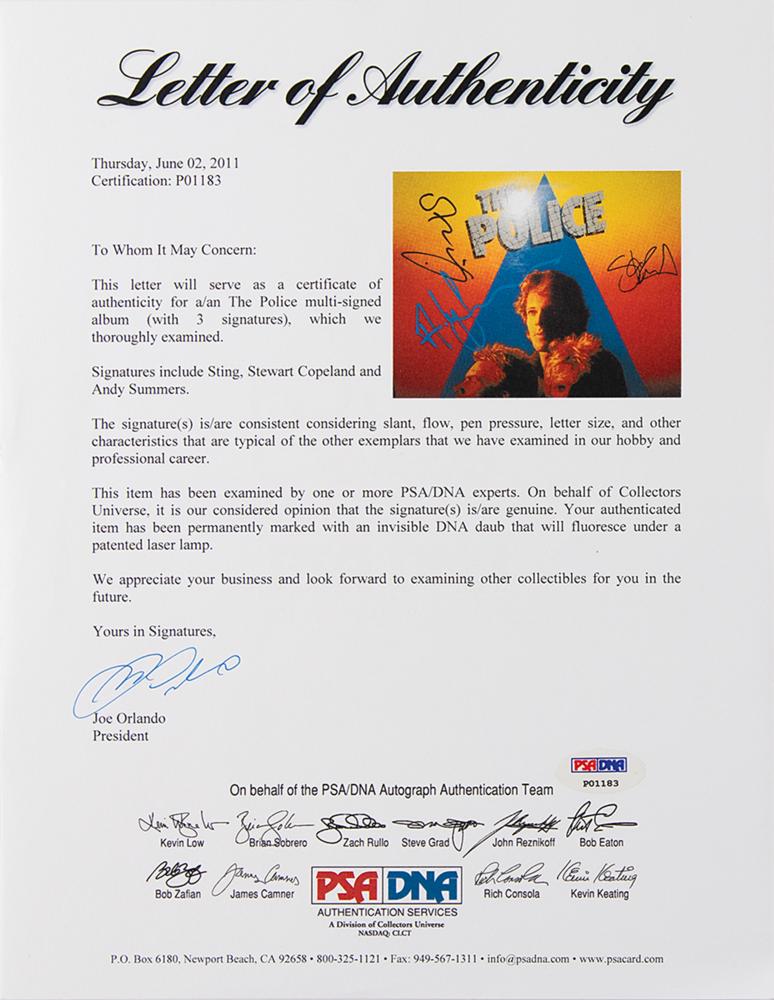 Zenyatta Mondatta album signed on the front cover in black felt tip by Sting and Stewart Copeland, and in blue paint pen by Andy Summers. In fine condition. The record is included. Accompanied by a full letter of authenticity from PSA/DNA.
