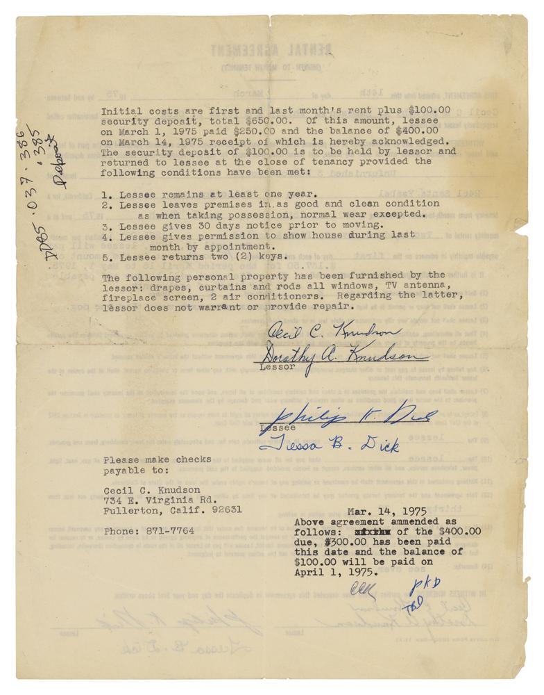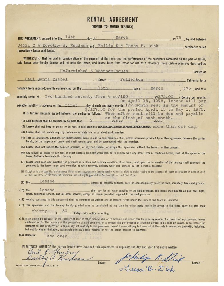 Twice-signed DS, one page, 8.5 x 11, March 14, 1975. Rental agreement between Cecil and Dorthy Knudson and "Philip K. & Tessa B. Dick," who agree to rent an "Unfurnished 3 bedroom house located at 2461 Santa Ysabel Street, Fullerton, California, for a tenancy from month-to-month?at a monthly rental of?$275." Signed at the conclusion in blue ballpoint by both Dick and his wife, with both also signing again on the reverse. In very good to fine condition, with short edge tears, and a light stain to the left edge.