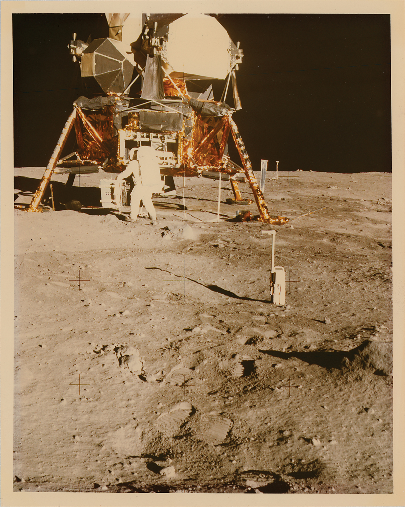 Original vintage color glossy 8 x 10 photo of LMP Buzz Aldrin unpacking the Laser Ranging Retroflector (LRRR) and the Passive Seismic Experiment Package (PSEP) from the base of the Lunar Module during Apollo 11, with the Apollo Lunar Surface Closeup Camera (ALSCC) seen in the foreground. Reverse bears “A Kodak Paper” watermarks. In very good to fine condition, with light irregularity to the emulsion, visible at an angle.