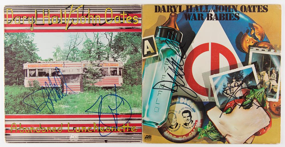 Two albums by Hall and Oates—Abandoned Luncheonette and War Babies—both of which are signed on the front cover in black or blue felt tip by Daryl Hall and John Oates. In overall fine condition, with separation to the top edge of War Babies. The records are included.